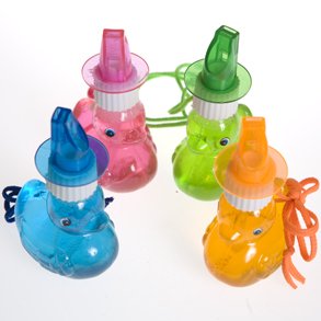 Not Just For Bathtime Ducks! The Duck Bubble Whistle is an entertaining party favor for the kids, or maybe just the kid inside you! 4 3/4" long and 2 3/4" wide. Yellow plastic duck with assorted color whistle toppers. Bubble wand attached to cap. Each with assorted color nylon necklaces. These duckies are great party favors for baby showers, birthday parties and any ducky theme event. Part of Favors, Toys, Gifts > Bubbles