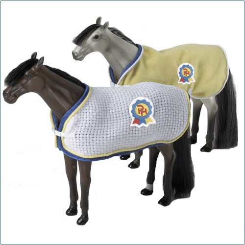 Our white woven cotton anti-sweat sheet features blue trim and yellow piping. The lightweight closely-woven fabric is extremely absorbent and very durable. Like the anti-sweat sheet our heavyweight yellow stable blanket with blue and white trim also features the Paradise Horses embroidered monogram for easy identification. Both the stable blanket and anti-sweat sheet fasten with velcro and fits both the horse and pony.